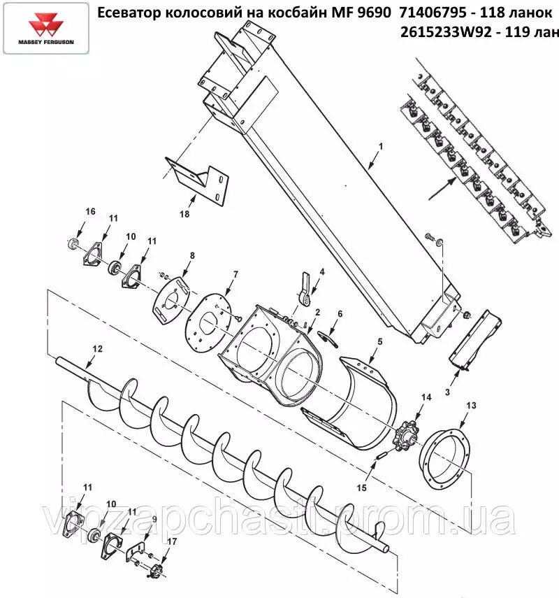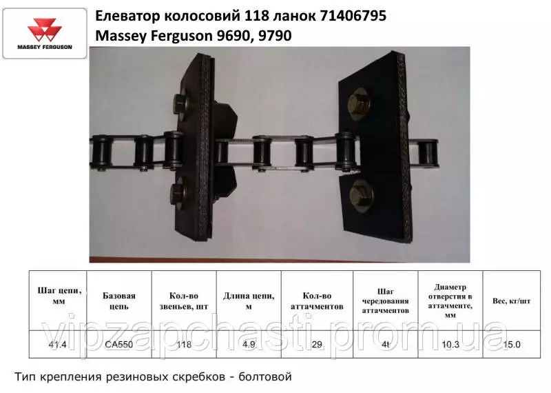 Елеватор колосовий на комбайн Massey Ferguson 9690, 71406795 (транспортер колосовий, ланцюг елеватора колосового)