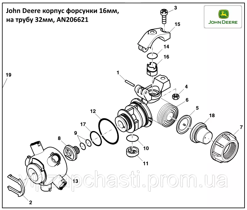 Форсунка на опрыскиватель John Deere, AN206621 диаметр трубы 32мм, отверстие 16мм