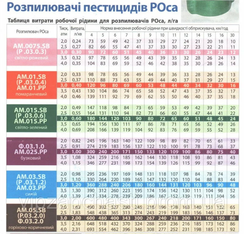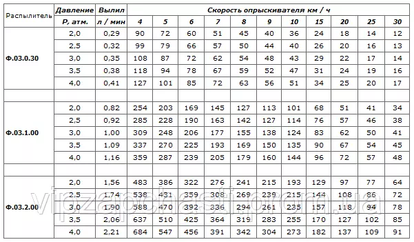 - распылители Р.03.2.0 одной заправкой опрыскивателя с баком 2000 литров при скорости движения 30 км/час позволяют провести опрыскивание на площади 25 га, но могут внести и 300 л/га на скорости 8 км/час;