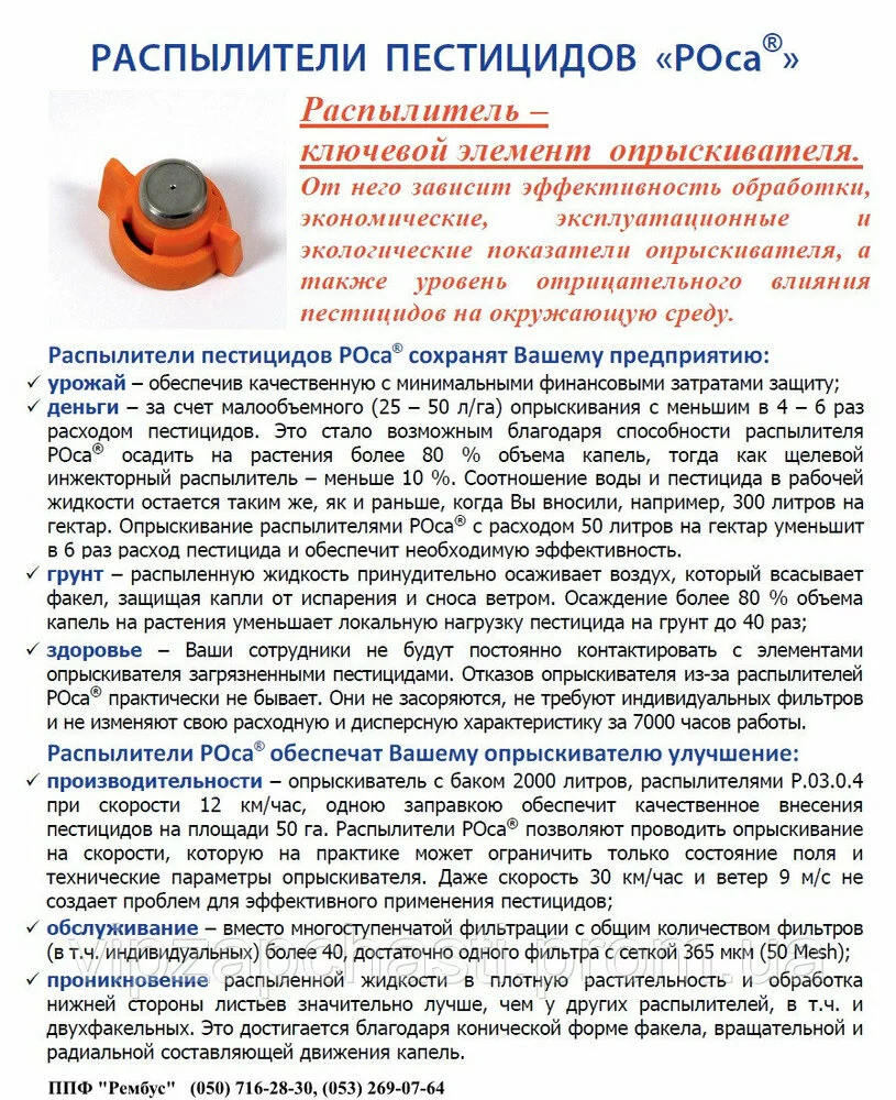 - надежные ― не засоряются и не нуждаются в индивидуальных фильтрах, отказов опрыскивателя из-за распылителей РОСА практически не бывает, корпус и сопло изготовлены из нержавеющей стали;